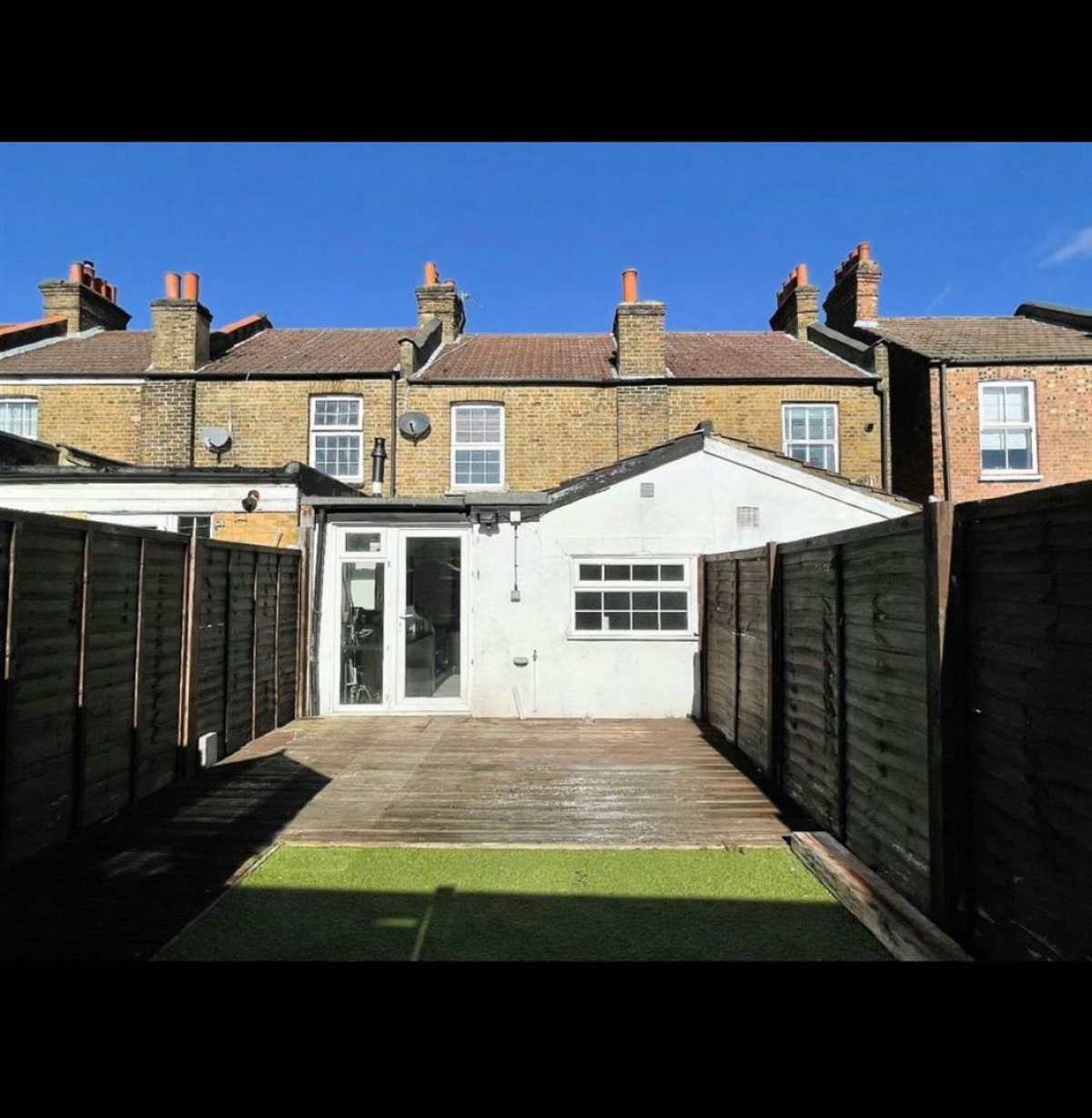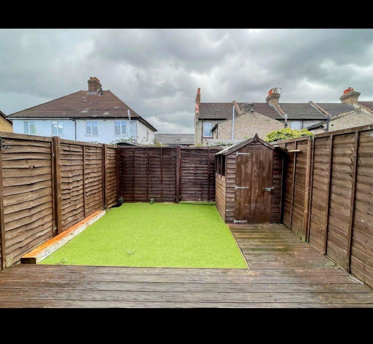 • Small formal front garden, 30 ft rear garden which enjoys a sunny southerly aspect, comprising a sizable deck terrace, an Astroturf lawn and a timber shed